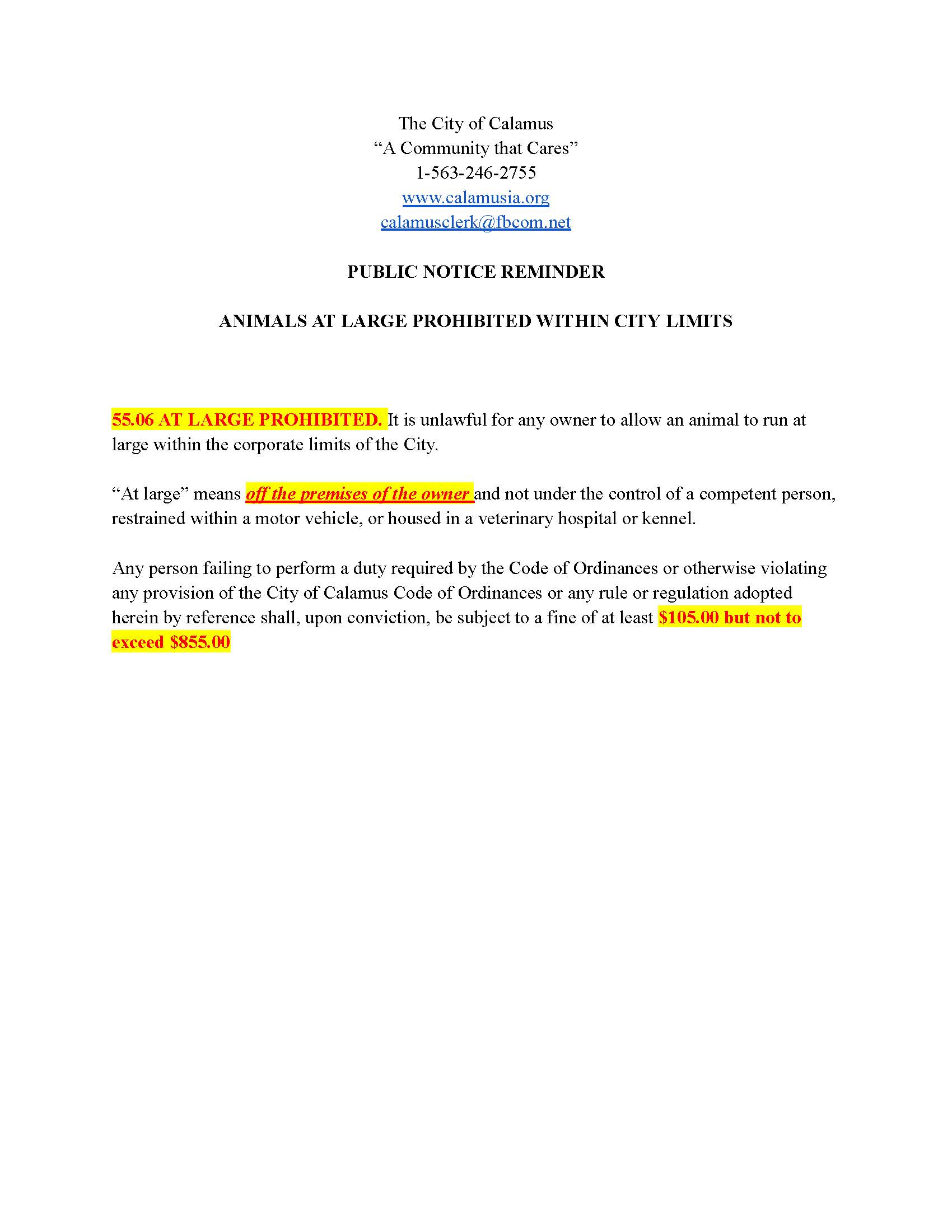 large within the corporate limits of the City. A copy of the Clinton Humane Society Agreement can be found here . Citizens who find dogs at large within city limits who would like to transport the dog to the humane society should contact the Public Works Department first determine if the owner can be identified or to obtain permission to take the dog to the humane society under the City of Calamus account.