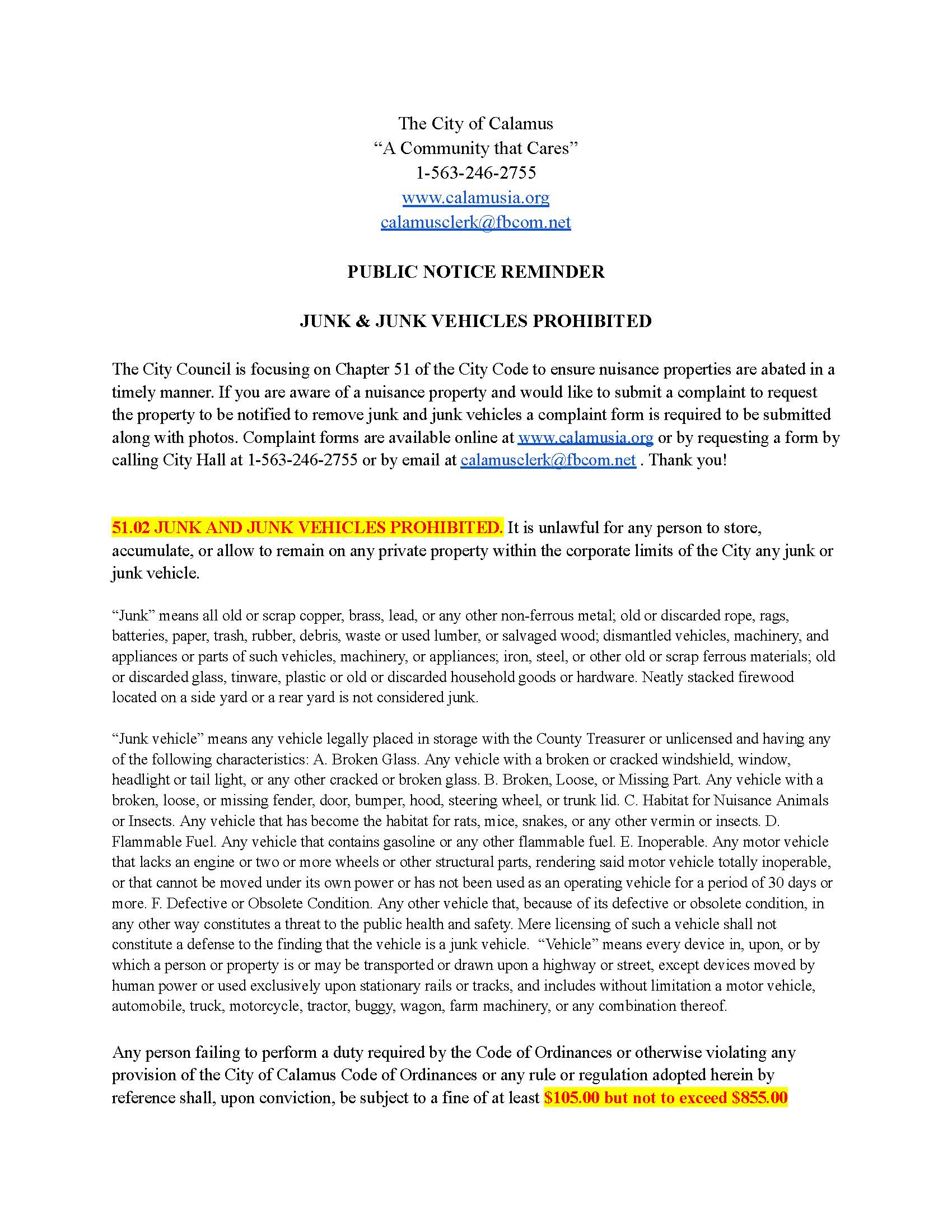 City Council meetings are on the 4th Monday of each month at City Hall at 7:00 p.m. Minutes from the meeting are posted at city hall, the post office, and First Trust & Savings bank within 15 days after the Council Meeting. Minutes are also published in the Dewitt Observer and posted on the city website www.calamusia.org. We hope this information is helpful, thank you!